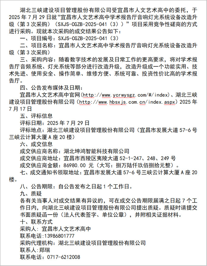 宜昌市人文艺术高中学术报告厅音响灯光系统设备改造升级(第3次采购)成交结果公告 |